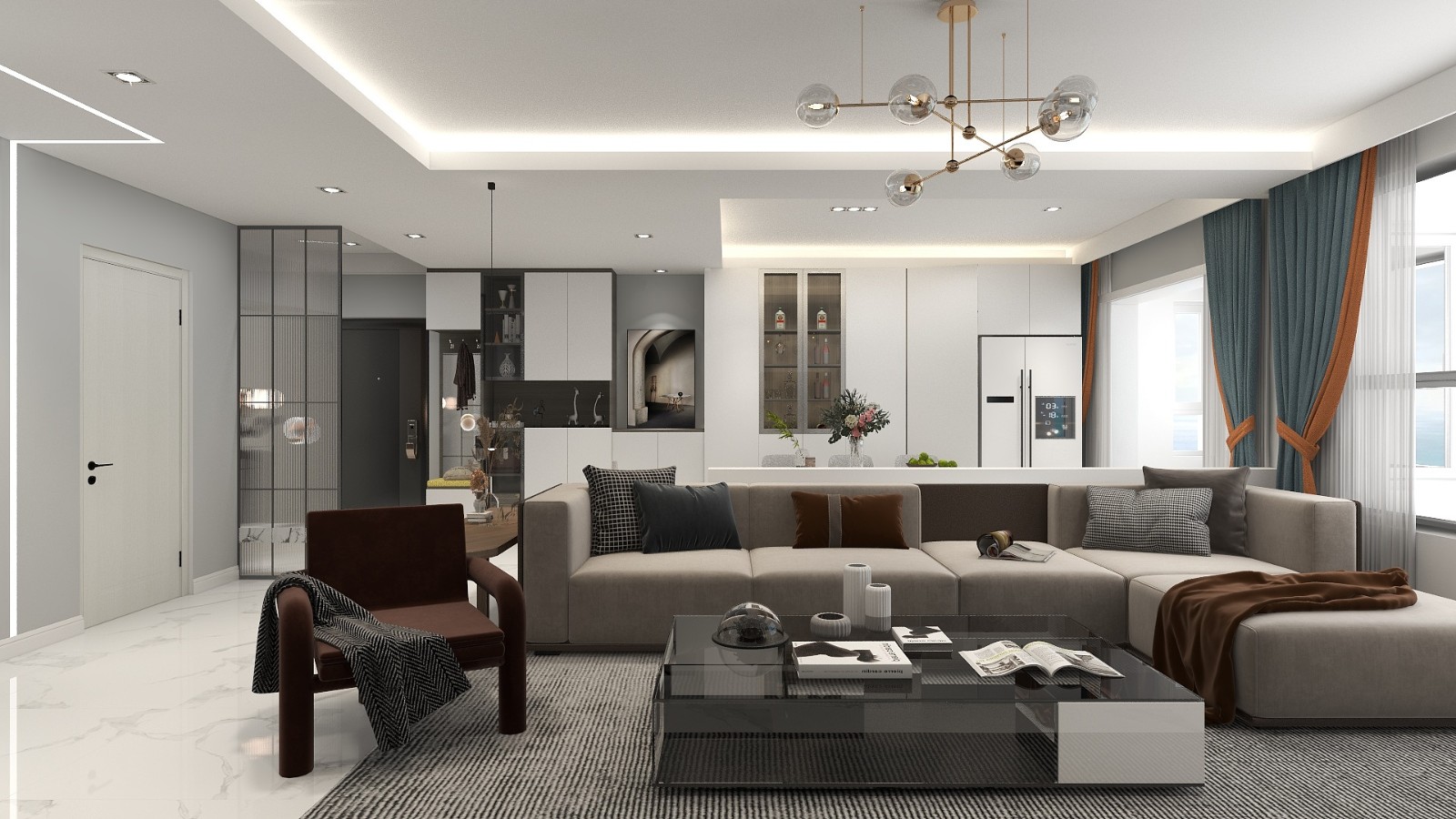 屋内整体以黑白灰为主色调,电视背景墙采用岩板设计,餐厅和客厅之间采用导台设计,在视觉上使得空间更敞亮,给居者营造出时尚前卫的感觉。