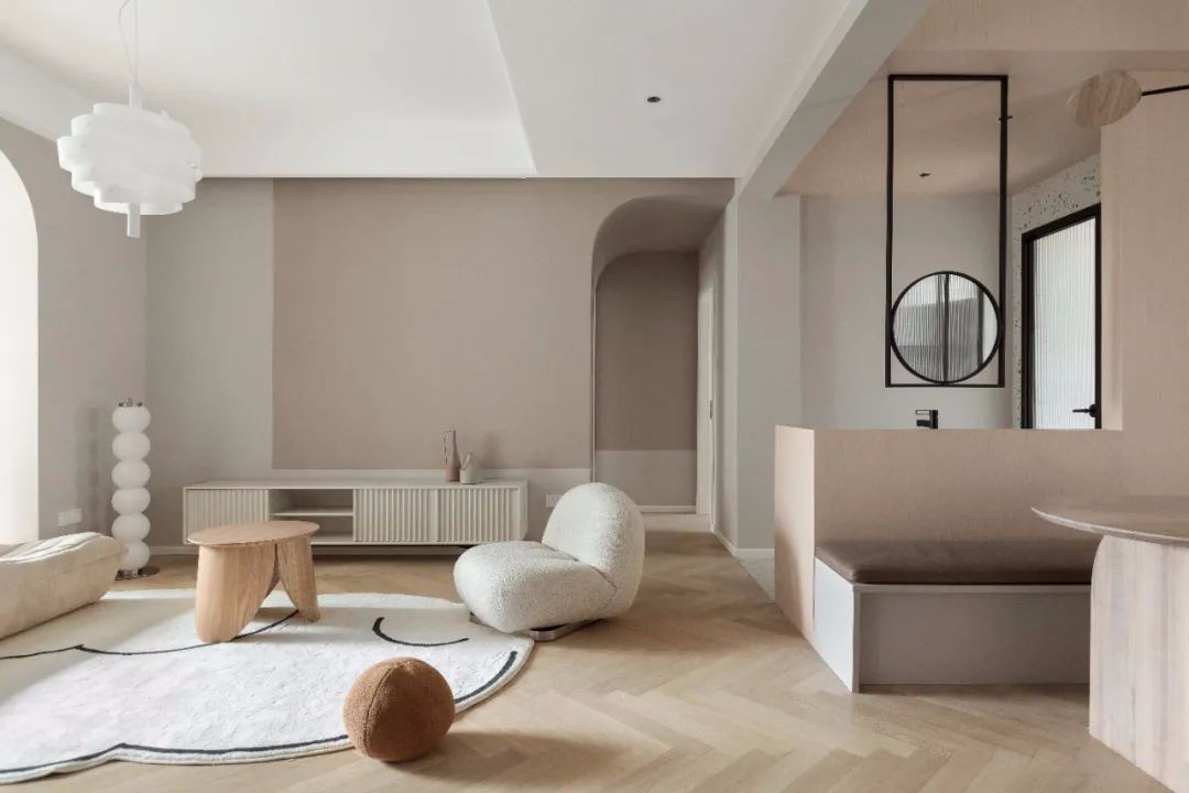 客厅橡木地板以人字拼贴法落地,墙面上选择反差小、饱和度低的乳胶漆,打造温馨轻奢的主基调,花瓣可随处摆放,美观的同时保证一定的置物功能。