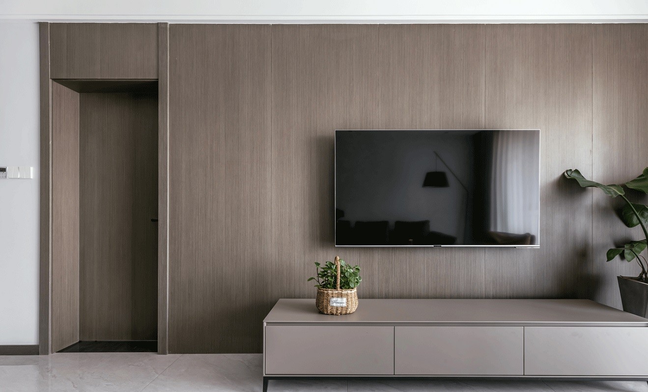 蓝色的背景墙、灰色的柜体,蓝灰拼色让整个空间静谧下来,