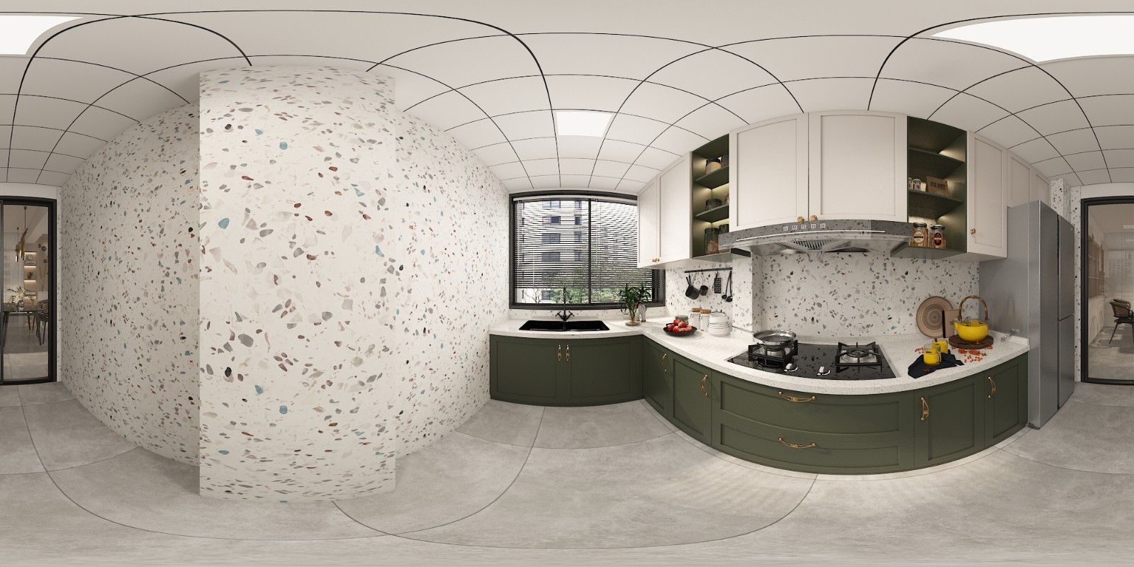 造型用作北欧空间 水磨石的浅色瓷砖搭配墨绿色的橱柜