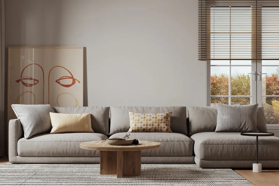 客厅整体造型简洁,没有过多的装饰造型,直接采用暖灰色的乳胶漆和布艺沙发搭配,与整体地面的原木色地板结合,冷暖适宜,比较舒适。
