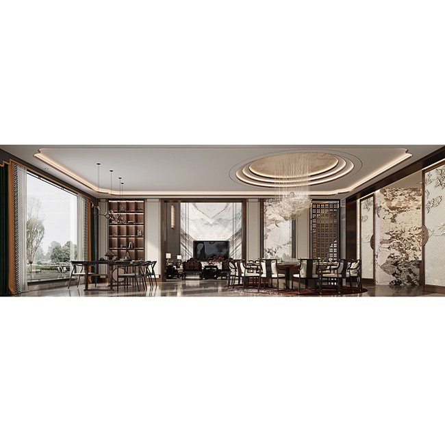 新中式联排别墅可以设计开放式的客厅,客厅和餐厅、厨房完美地融合在一起,这样的话空间上不会给人拥挤的感觉,反而显得大气十足