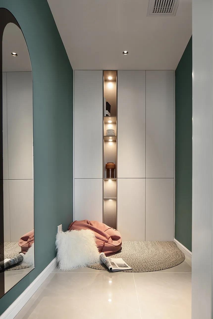 两侧蓝绿色的墙面,中间定制的衣柜加入开放展示架,可以摆上装饰品或书籍,结合舒适优雅的布艺懒人沙发与地毯,让空间显得温馨浪漫而***。