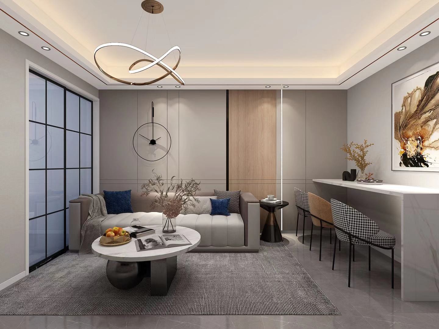 受原建筑户型的影响整体的公共空间并不是很大,业主也需满足各个方面的功能去,所以在餐厅区域的设计上选择了类似于卡座式的设计,风格于材质上的表现融为一体也不相互影响,生活动线的考虑上也符合人们的生活方式