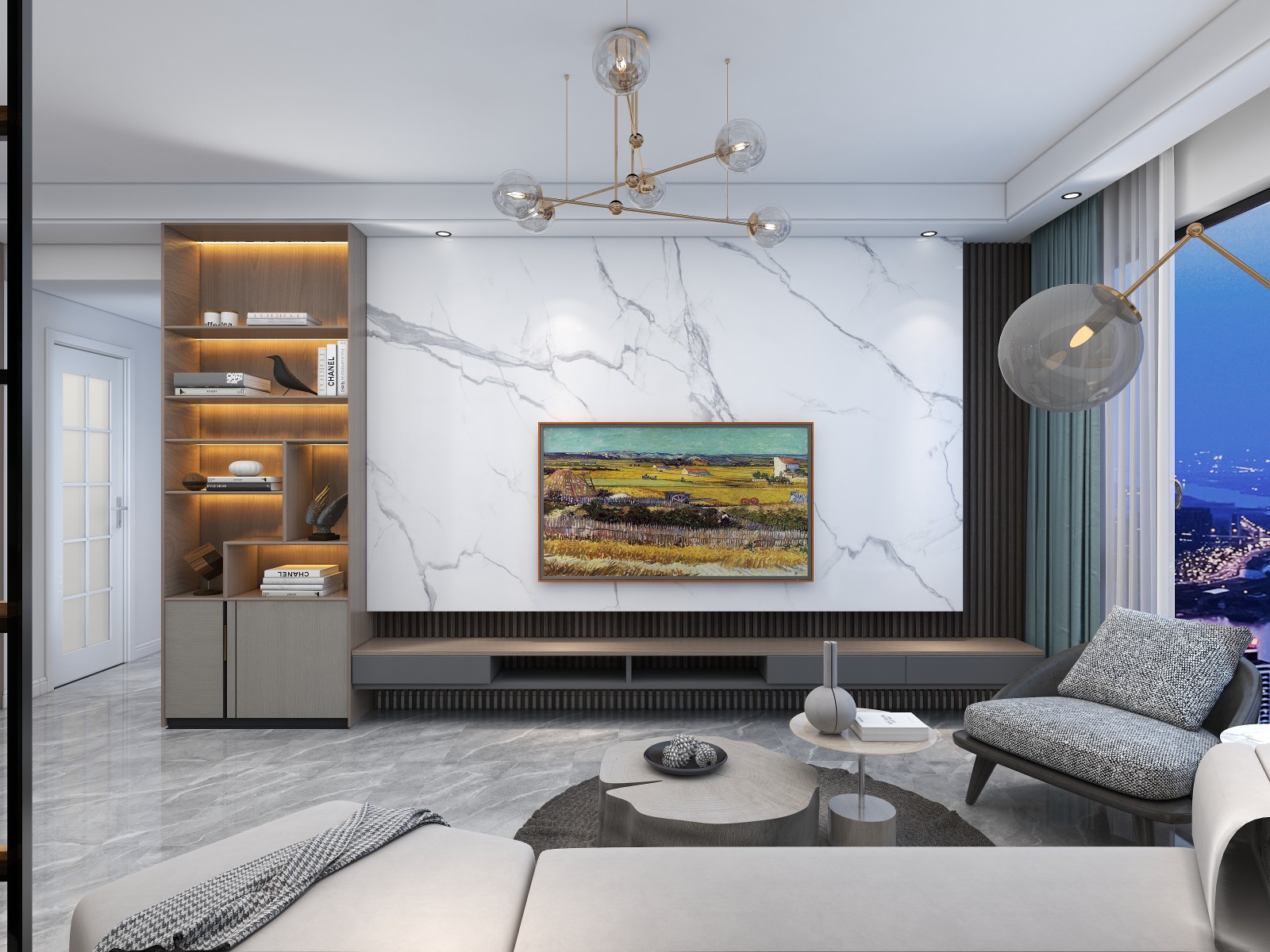 客厅仿大理石材岩板,定制电视柜储物展示功能。电视柜做抽屉式设计增加储物功能。