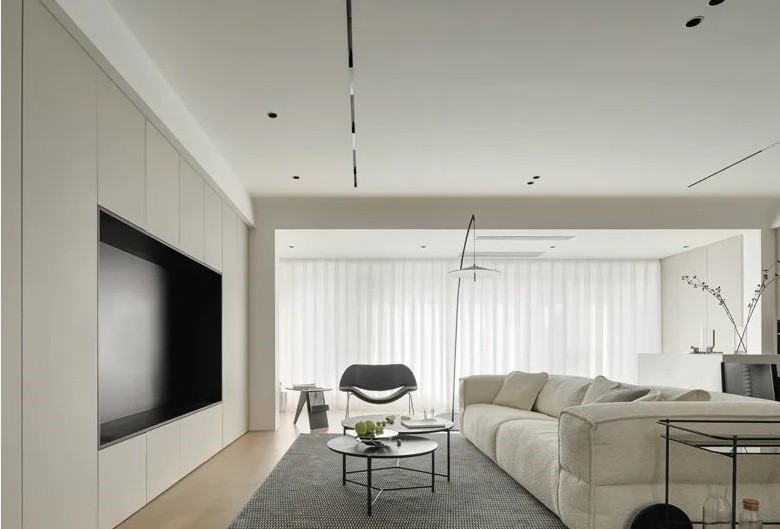 客餐厅吊平顶,采用无主灯设计,磁吸轨道灯、筒灯、落地灯之间相互配合,对光源进行分区、组合,
