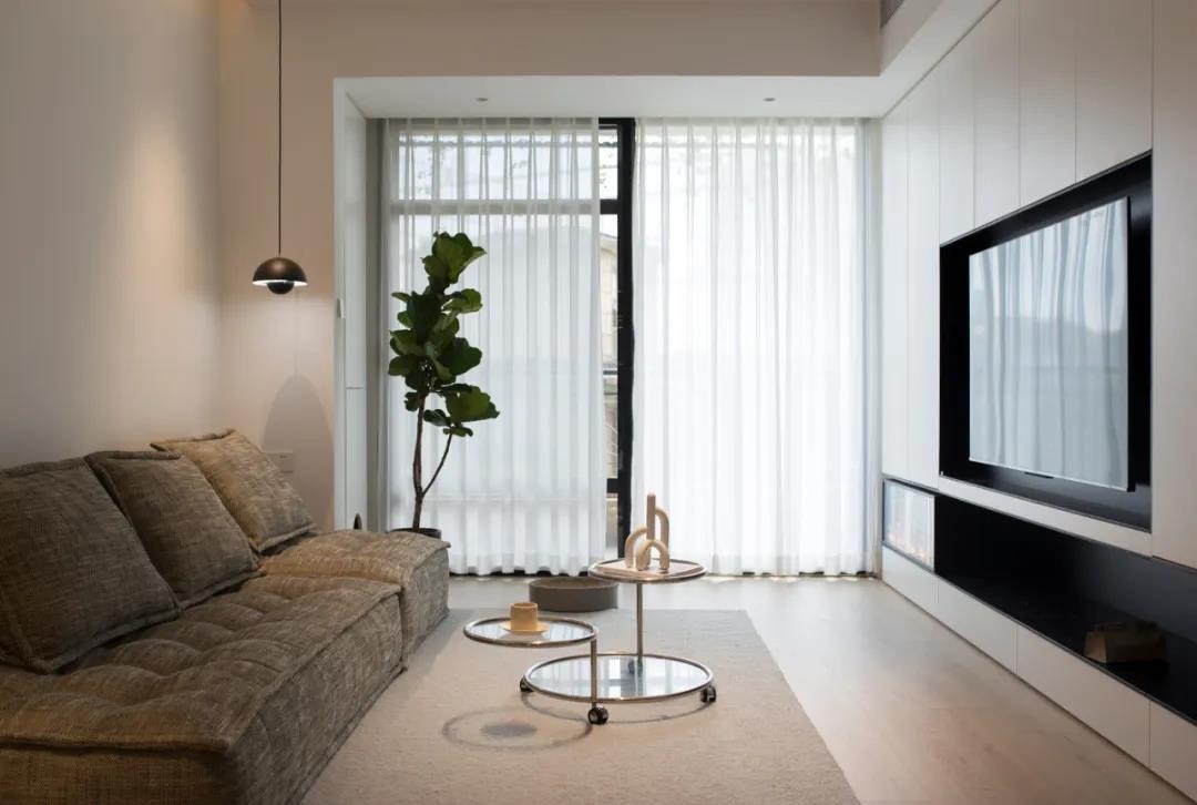 白色窗帘过滤光线后让整个客厅更加柔和。