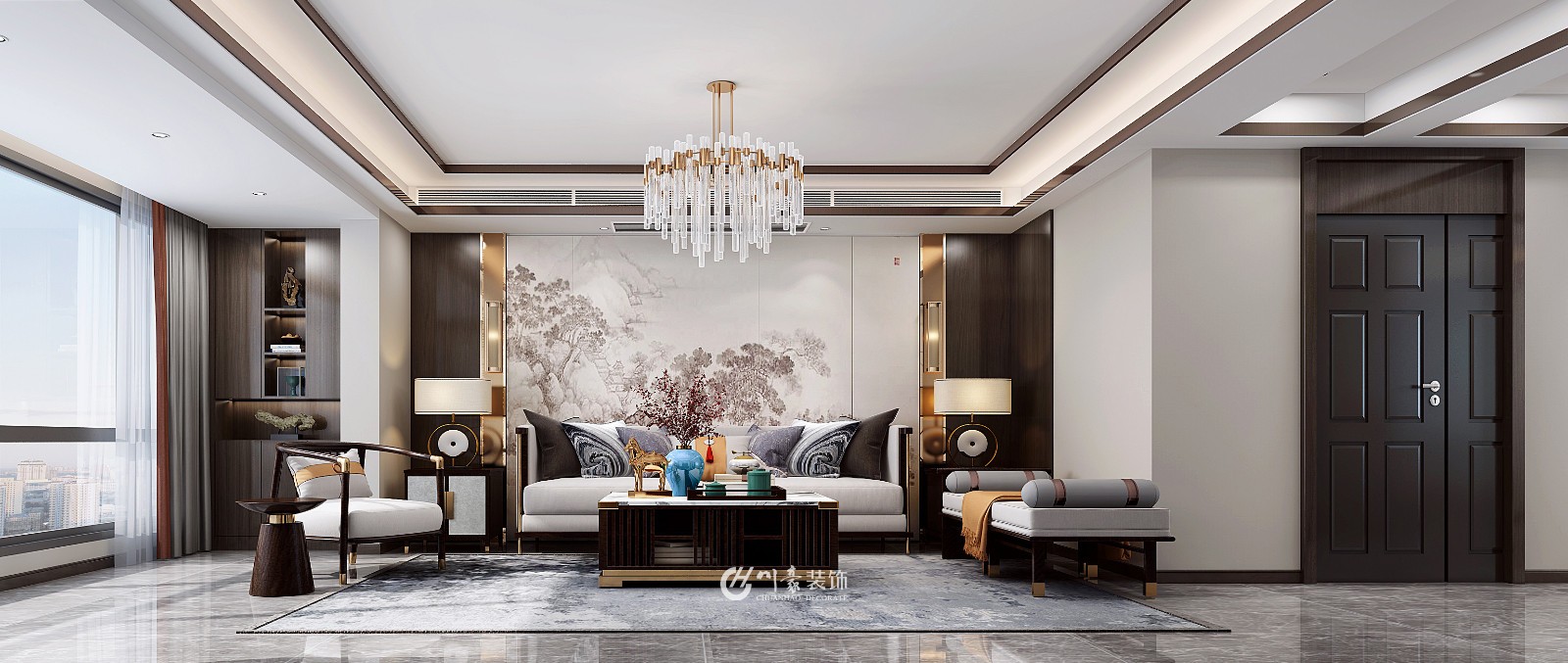 客厅背景墙采用山水纹石材。