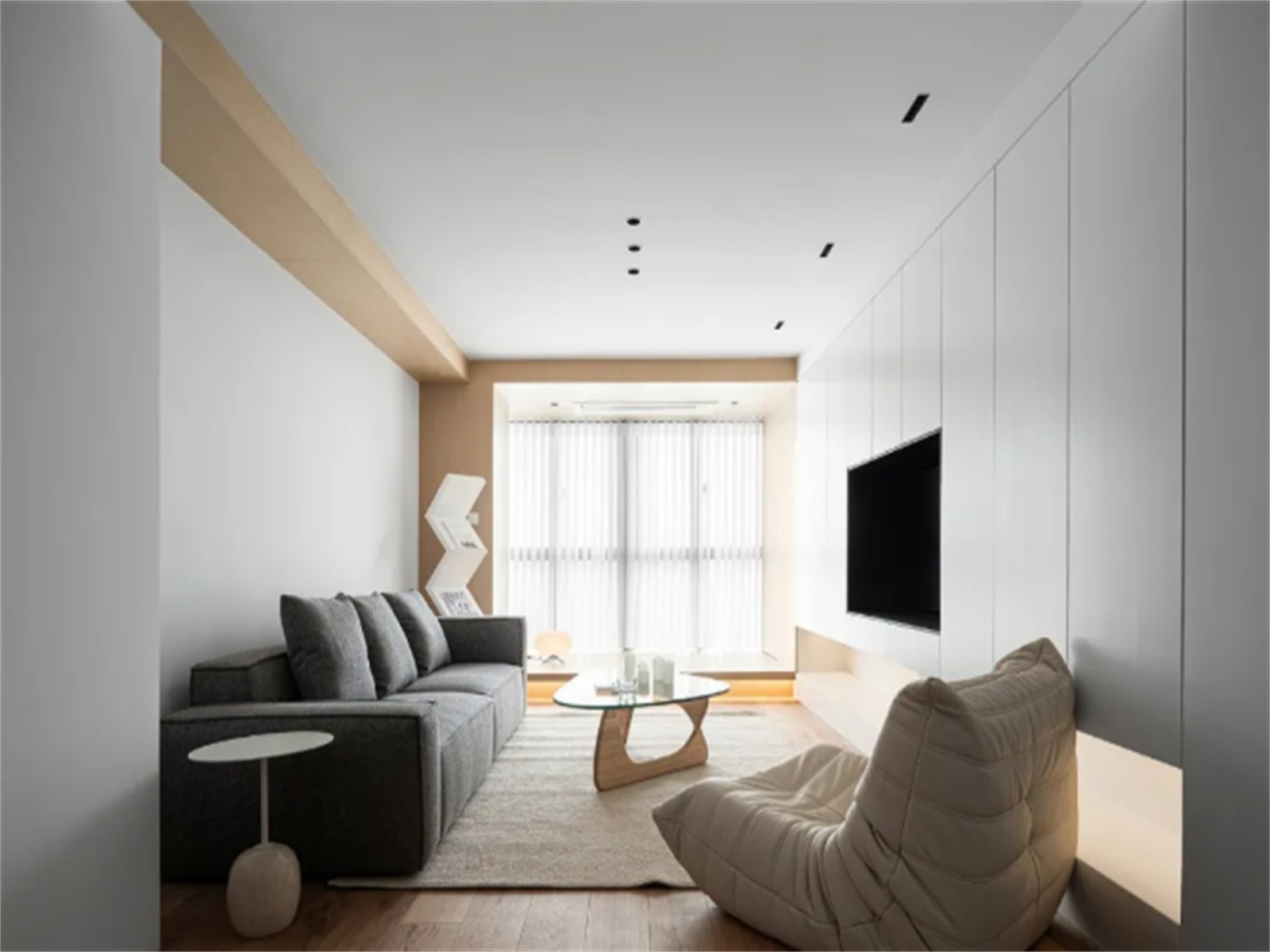 客厅,整个空间以白色与木色为基调,搭配出自然舒适的居家氛围,打造整墙电视储物柜,提供强大的收纳功能