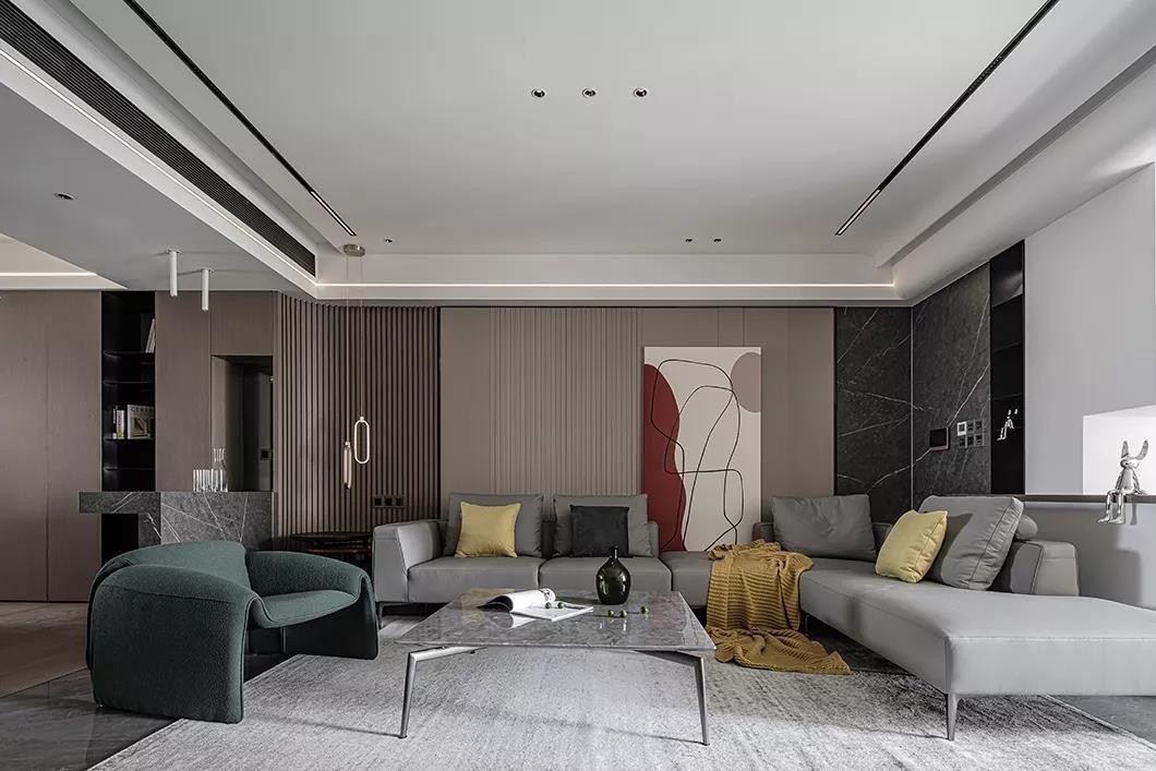 沙发、桌椅、壁画、电视墙之间气韵相连,共同折射出美好生活语境中的审美取向,优雅于不露痕迹之处缓缓荡开。