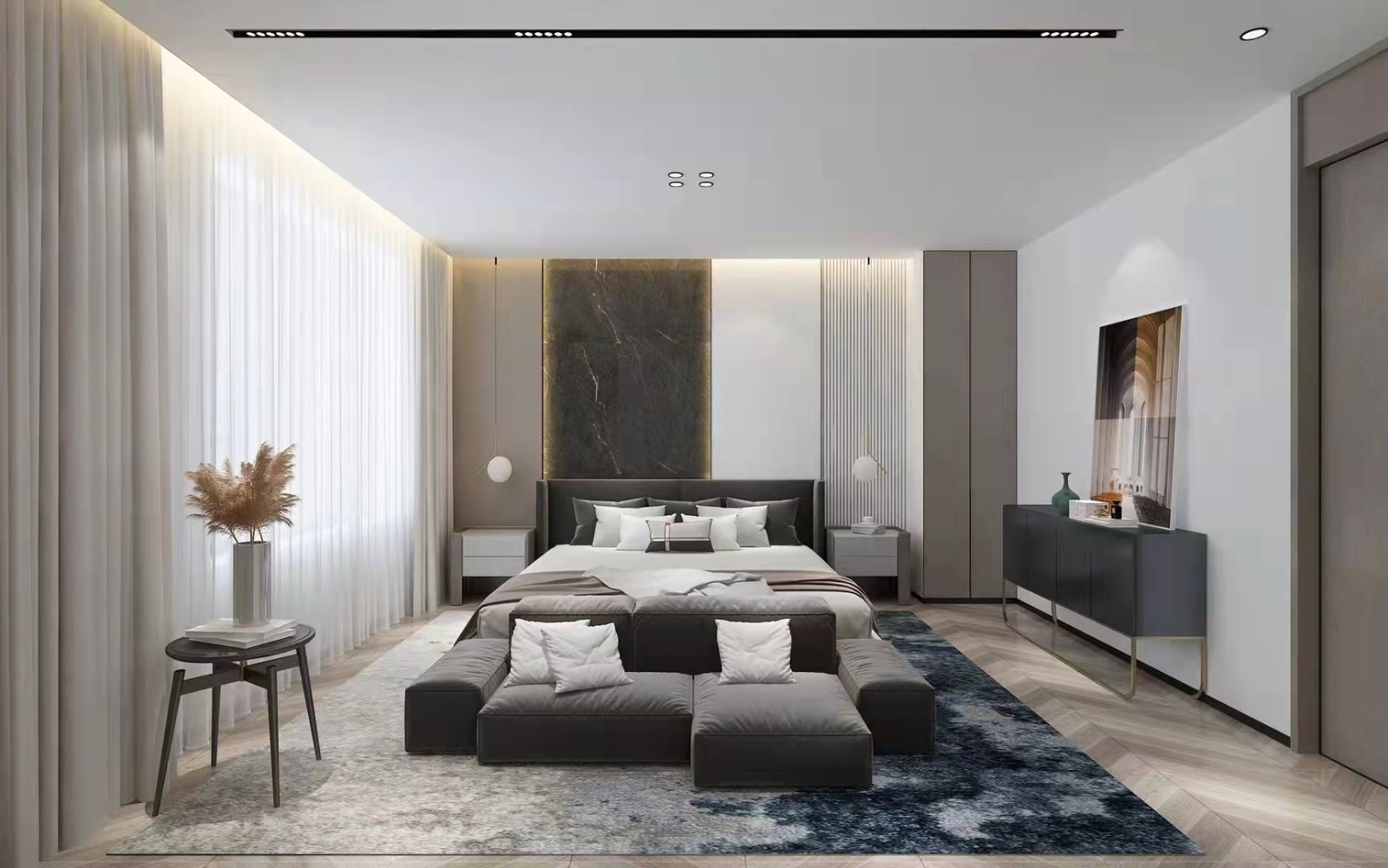 本案为现代风格,以灰色为基调,整体风格优雅大气,黑白灰提升整体空间效果。