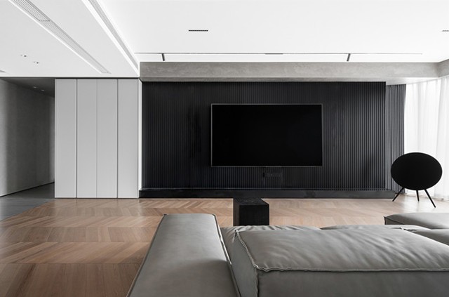 考虑到看电视的舒适度,背景是用黑色的烤漆格栅来做的,定制烤漆门板的收纳柜。
