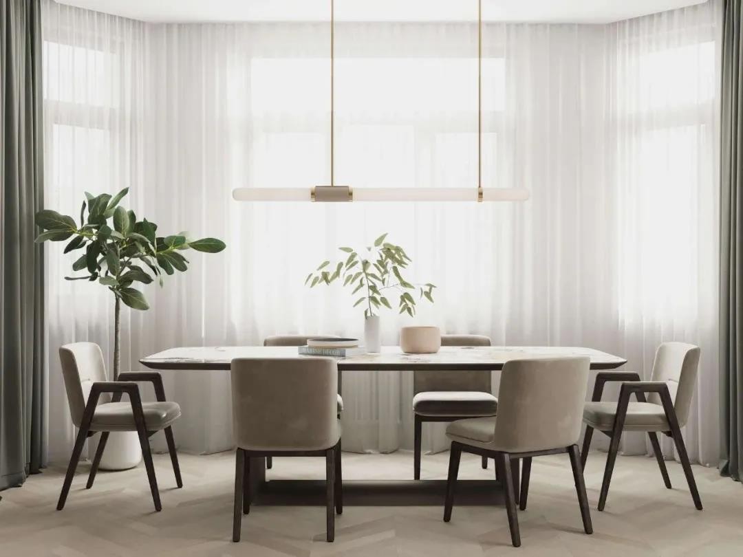 厨房与餐厅选用开放式设计,位于客厅旁边。白色大理石餐桌与厨房相呼应,营造了轻奢精致的空间氛围。干净利落的线条感又展现了空间的几何美感。大面的落地窗也为室内带来了柔和的光线,干净而纯粹。