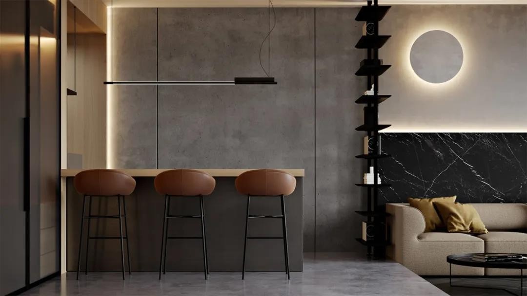 首先我们来到客厅 客厅和厨房相连呈现一体化 中间有吧台作为餐厅和隔断