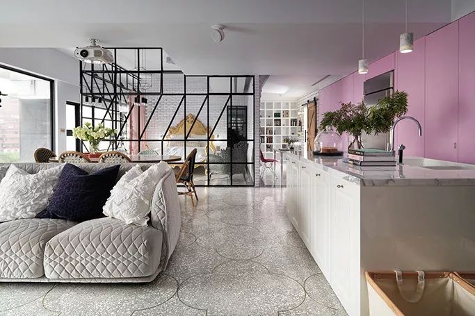 开放式空间将餐厨,客厅区域相互打通,白色中岛搭配大面积粉墙面与拉门的设计,用色大胆。
