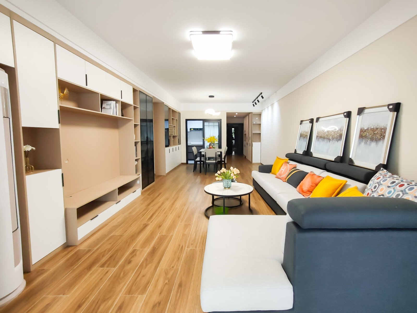 整个电视墙都由隐形收纳柜组成,视觉上具有空间感的同时也不失实用性。