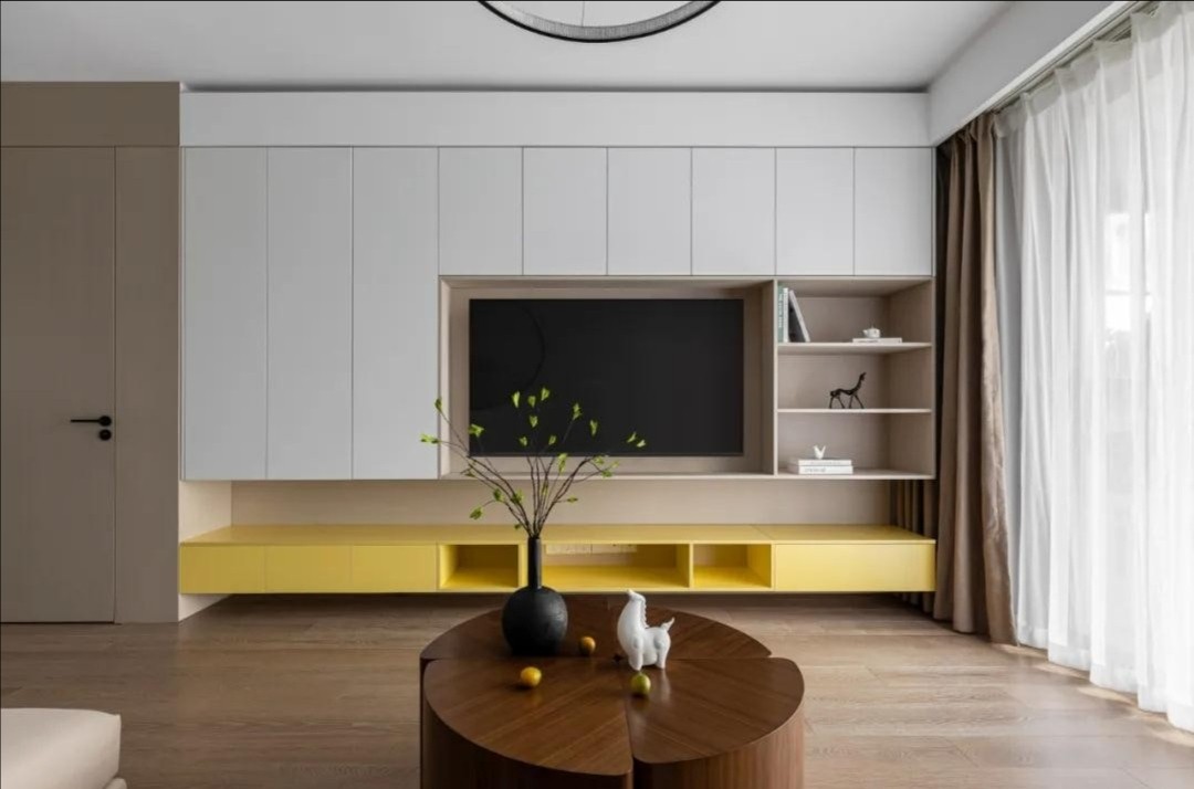 电视背景墙区域没有做过多的装饰,简单的电视柜以及书柜组合,不急可以装饰还增大储物空间