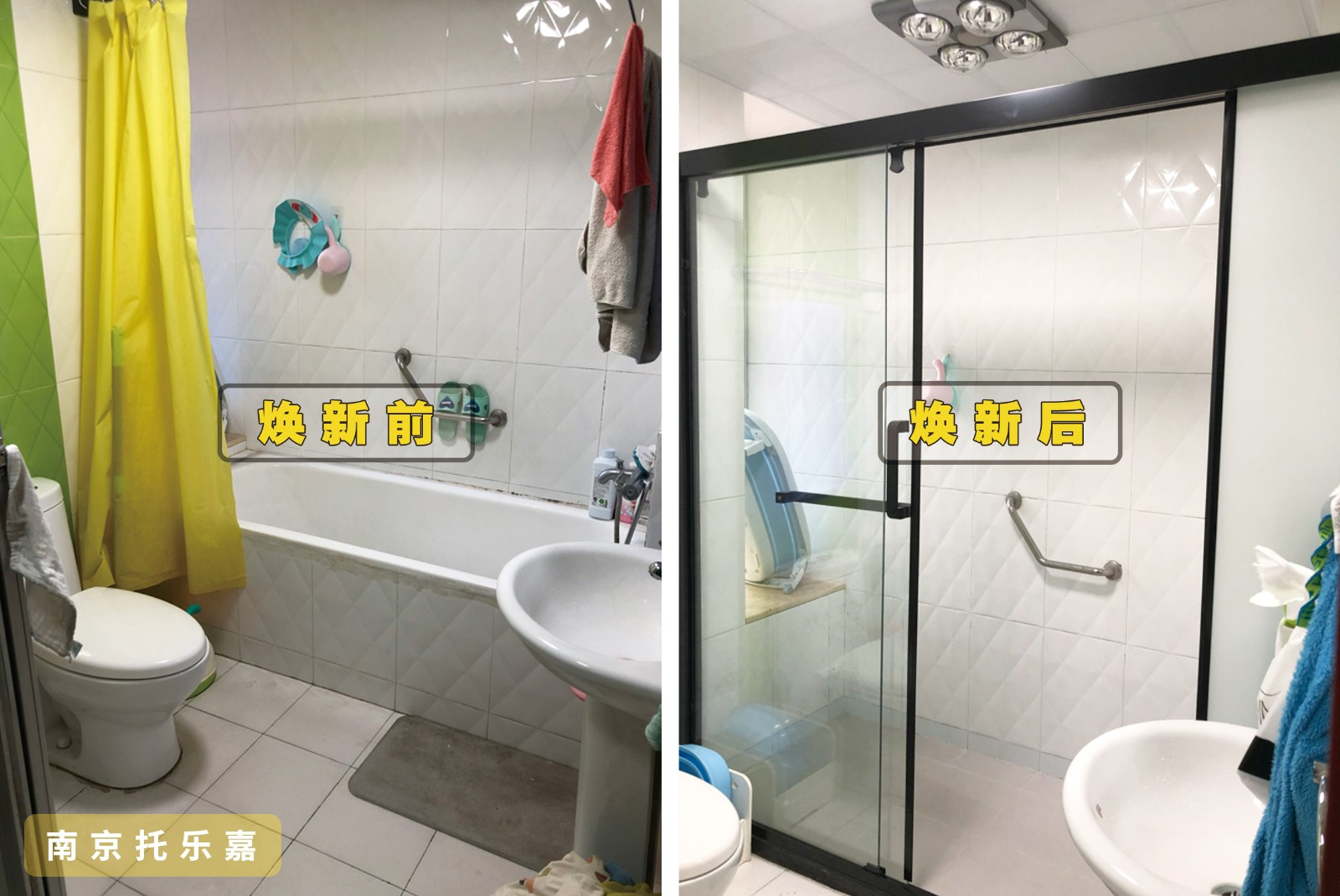 托乐嘉业主的浴缸完全占据了洗澡空间,每次洗澡都要“爬进爬出”,非常不方便。 经过万物焕新家的改造: 1、卫生间完全实现了干湿分离,生活品质大大提升。 2、我们采用了线条设计感很强的淋浴门,视觉上10年前的老房子瞬间进化成新房。