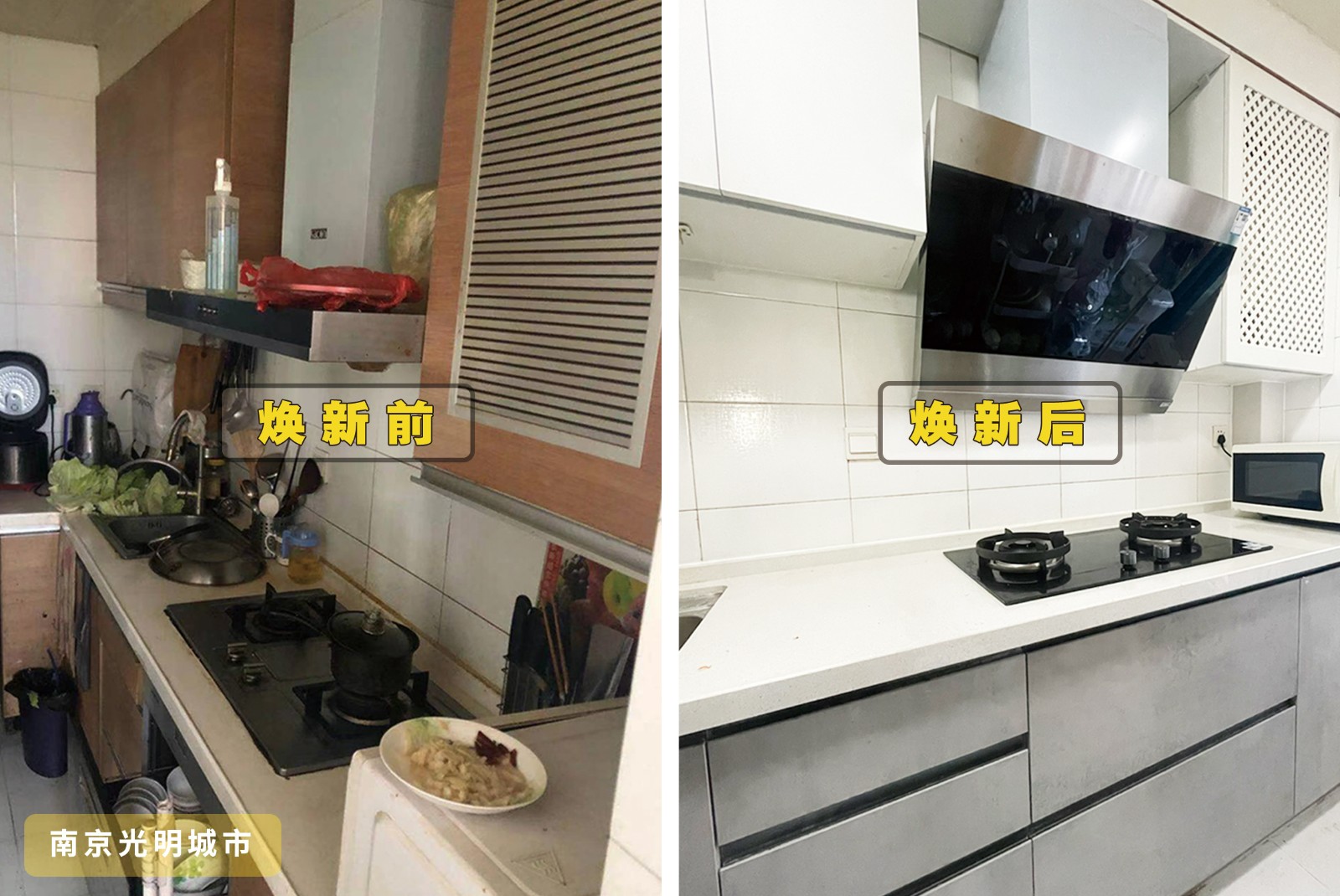 针对这类问题比较大的厨房,万物焕新家做了三大改造: 1、针对台面老旧和储藏空间不足的问题,我们进行了厨柜的整体焕新。整体采用大容量储物柜,设置顶柜和地柜,充分利用垂直空间; 2、针对厨房空间小、视觉不够开阔的问题,我们选用灰+白的主色调。对于开间不够大的空间,可以采取冷色调,可以让视觉更加开阔。 3、电器和五金硬件方面,油烟机根据业主的实际需求升级为侧吸油烟机,在做饭的时候不会碰