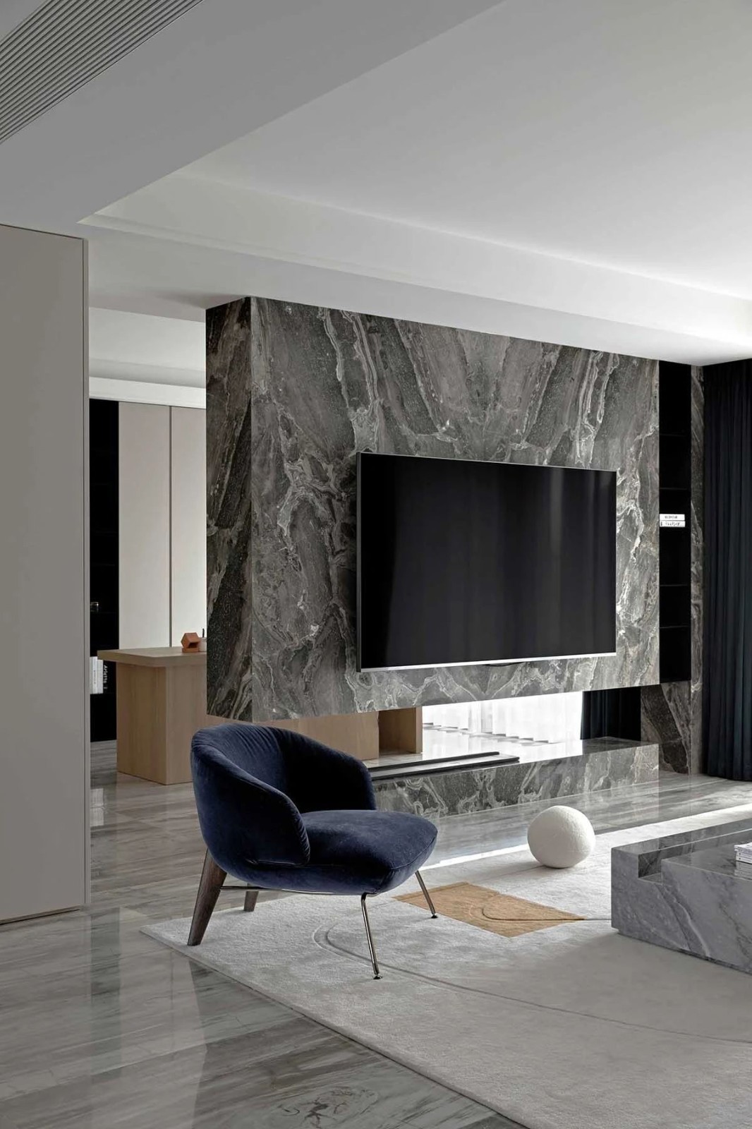 电视背景墙为悬挂大理石,沙发背景墙温柔的香草奶油色护墙,拥有明朗纹路,拉丝处理的石材,拼色沙发,绒布与皮革,冷与暖,柔软与坚硬,在这个空间中相互映衬和谐共存,有着自身刚柔并济的特点。与客厅相连的便是宽敞的餐厨空间。游离的深咖色在平静中增添了一份奇异的动感,友好地过渡在客餐厅的深浅之间.