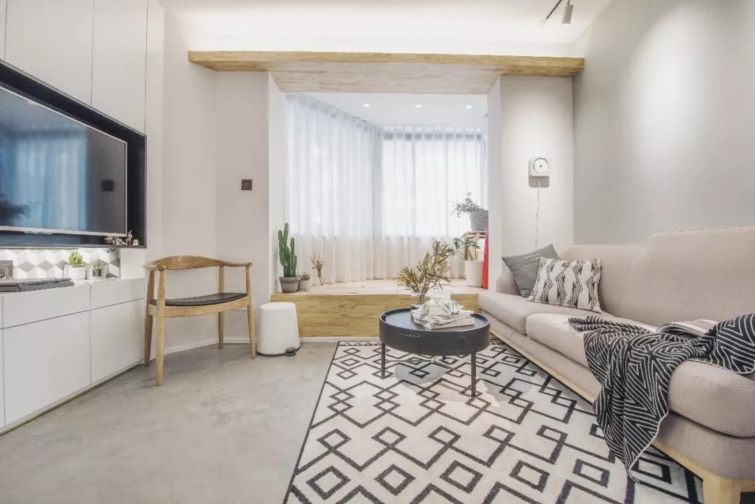 客餐厅就在玄关的边上,客厅内有一个弧形的窗户,被改造成了飘窗地台,在这里躺着看书、晒太阳,可是非常惬意的事情。