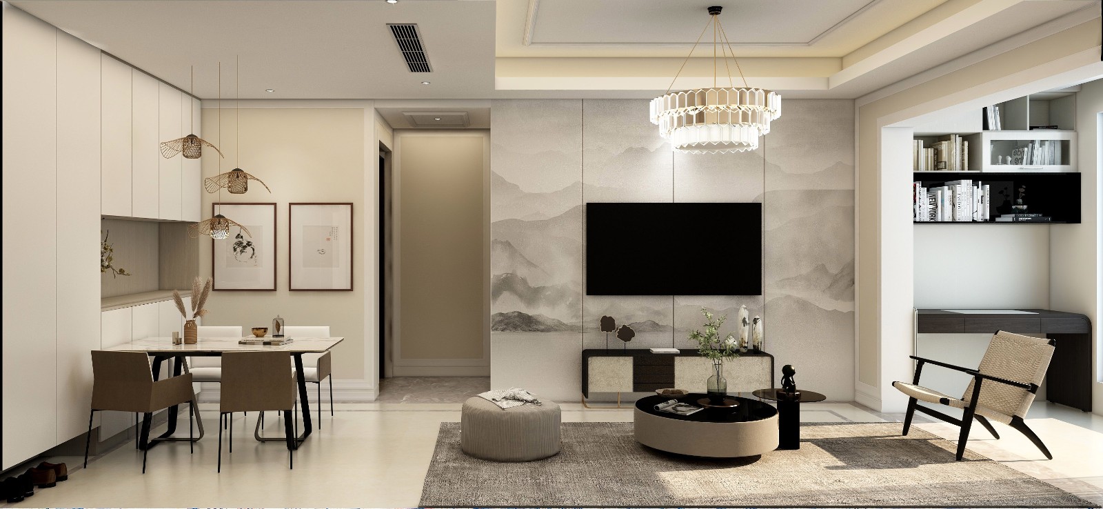 将客厅与玄关区隔墙打通,打开后的客餐厅区域拥有良好的互动关系,暖灰色微水泥地面让空间视觉表达统一有序。