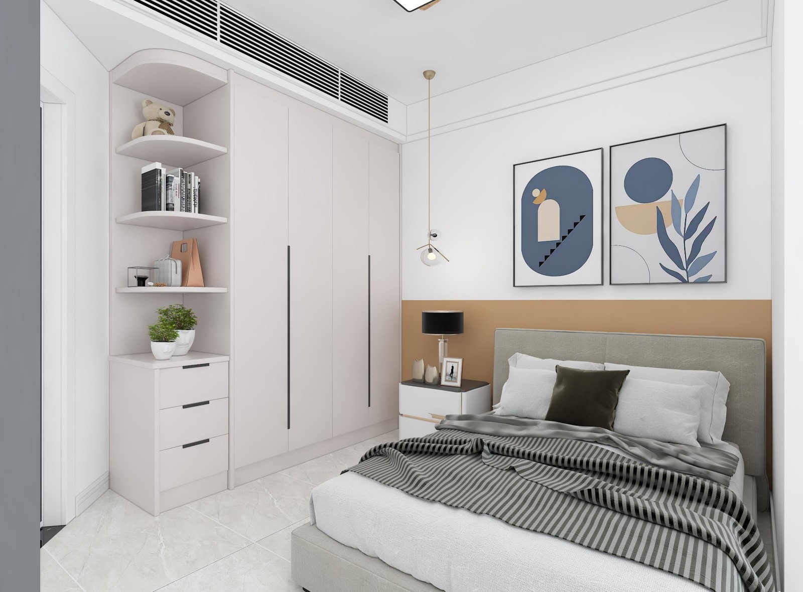 卧室也是灰白为主,蓝色装饰画点缀