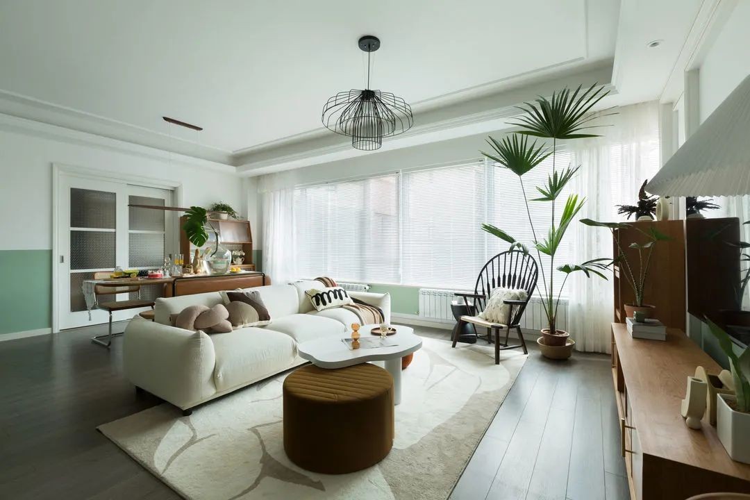 原有客厅纯白墙面且没有浮夸造型,装修没有进行大拆大改,保留原有硬装设计,只对墙面做了上下分色设计,豆绿色与纯白色想结合,自然清新也让空间层次更明朗。