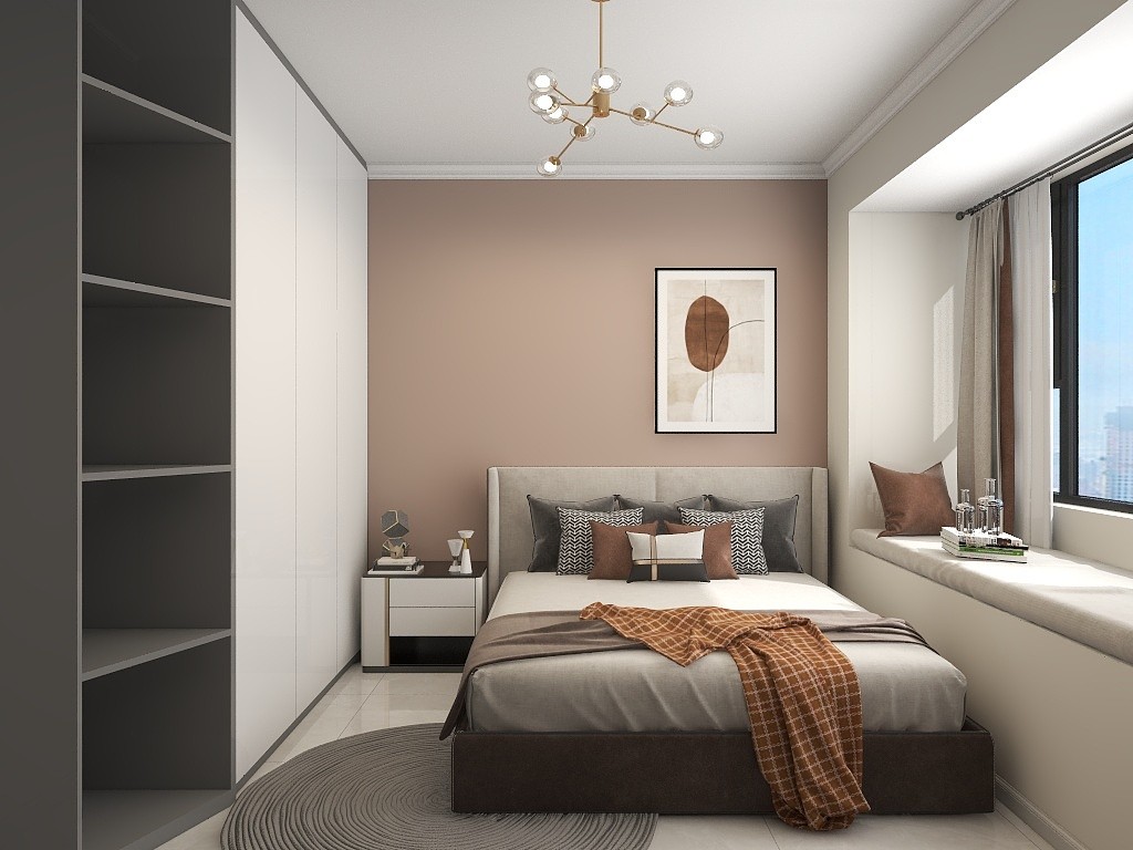 主卧采用温暖色调,中性色的家居软装,加以暖橙色提亮,整体简约有层次。