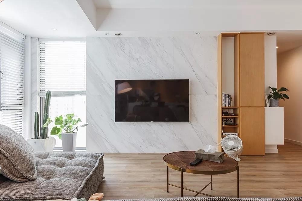简洁的电视墙巧妙藏起杂乱线路, 只要提前预留出管道洞即可。 摒弃传统电视柜,采用立式柜子, 强大的收纳功能解放了茶几, 屋主可以选购心仪的轻便款式