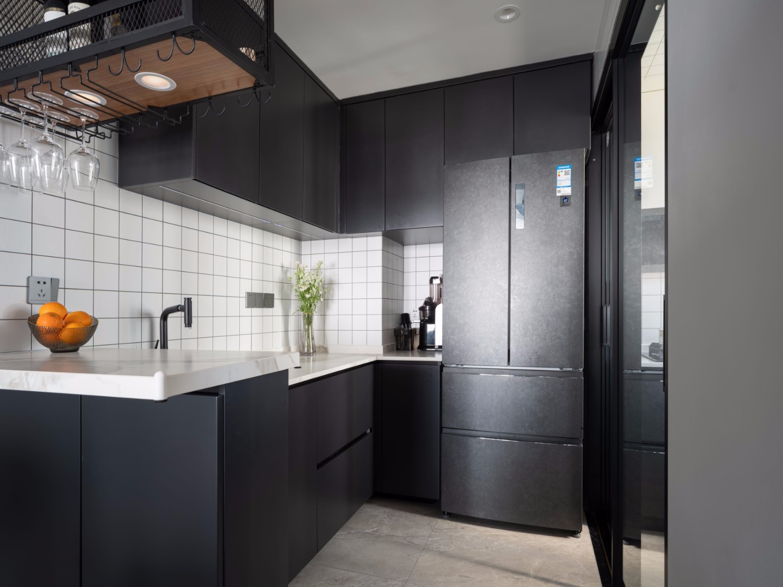 不规则黑色橡木茶几,灰色渐变玻璃瓶,插上禅意满满的南天竹,木与竹的搭配,带来几分典雅深沉的绿意。傍晚,于房中,翻开一页书籍,在窗边品一杯古茗,一页一体悟,一世一悠然。亦或是,两人相遇吧台前,笑谈今日所见,举杯赏酒,亦为人生之乐事。