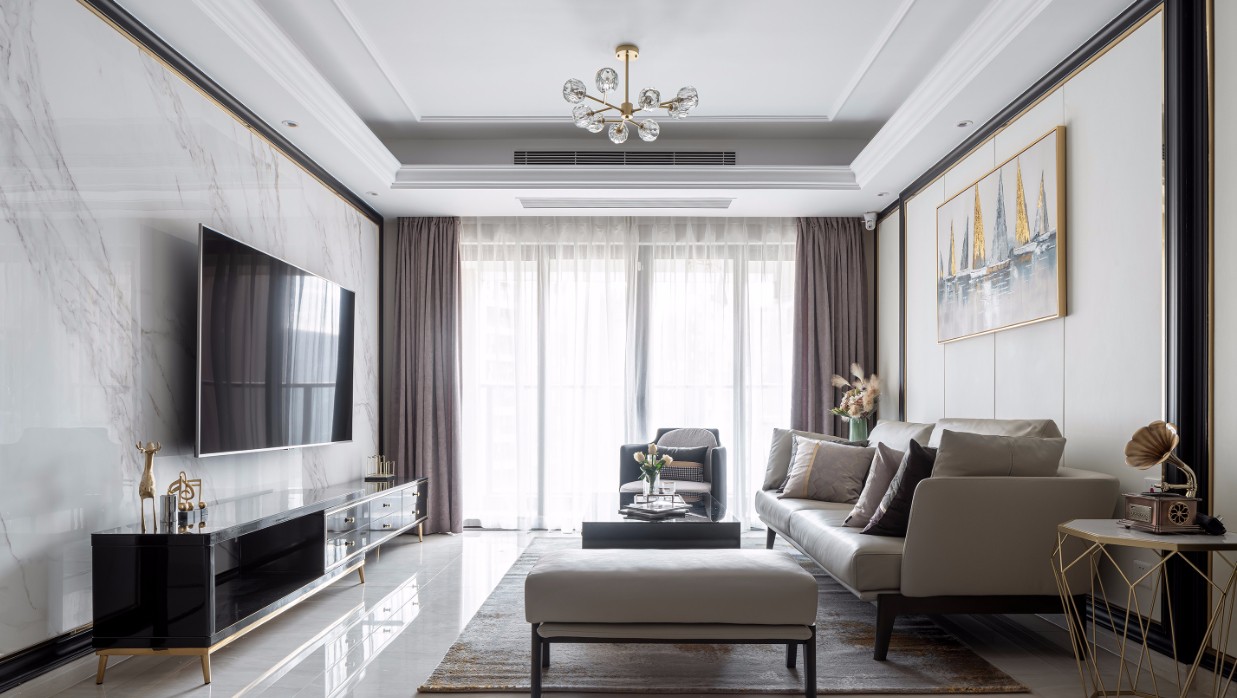 全屋保留了开发商留下的天花吊顶、地面铺设。厨房卫生间设施合理保留不变。通往卧室的走廊特意做了门套将客餐厅背景连为一体,客厅选择用三联爵士白大理石岩板做电视背景墙,简洁大气,与小两口的性格相匹配。餐厅墙面仅以实木线条与金属条做了框架,中间简单的调了色漆,金属墙饰增强整体的质感。