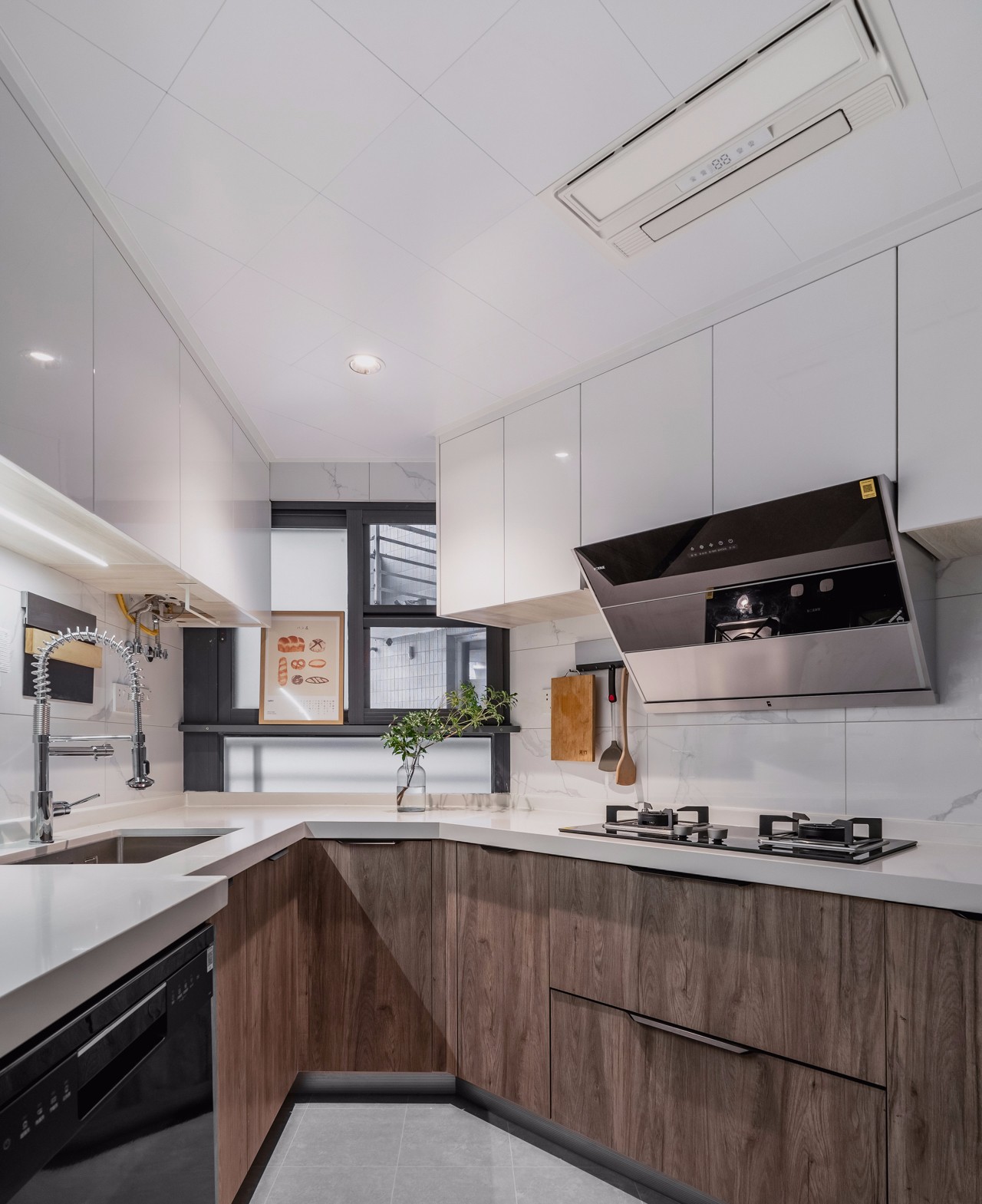 厨房采用的是U型格局设计,洗切炒的操作流程,地柜选择复古粗犷的木纹,耐脏耐磨,吊柜运用亮面的白色烤漆,有反光效果,墙面的瓷砖同样的道理,增强光线反射,使空间更加明亮不会暗沉。吊柜底部有预留灯带,切菜区域靠窗没有吊柜顶部增加筒灯直照操作台,方便切菜。