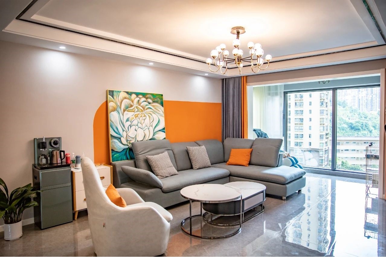 沙发背景墙觉得平涂太单调怎么办?学学这家人,用亮色和白色乳胶漆做弧形拼接,既免去了背景墙装饰的繁琐,还好看耐看,实在是聪明的性价比之选。