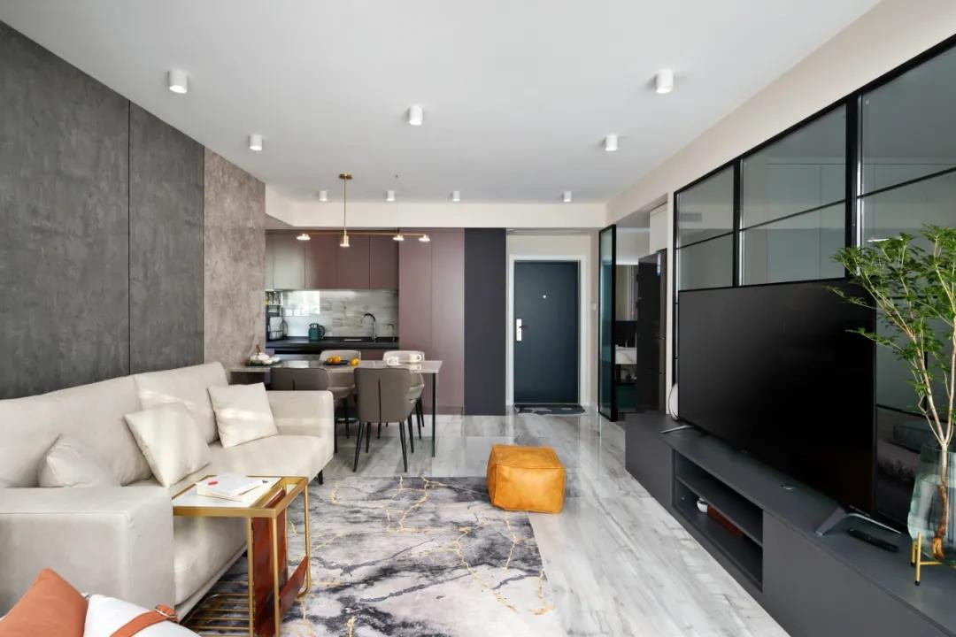 这是一套50平米的现代轻奢风装修案例,小小的一房一厅空间,以开放式的客餐厨设计,让小户型避开了小空间的拘束,而卧室也是采用玻璃墙的设计,让空间的采光与视线共享,视线更加宽敞大方的体验。