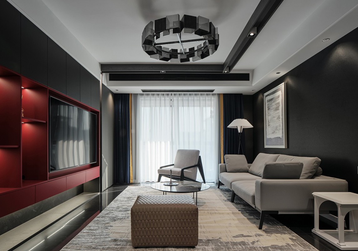 客厅以黑色系为主色调,少许红色柜体均衡了视觉的对比,运用大量体块以及线条,没有一处是多余,营造出一份现代空间的力量感。