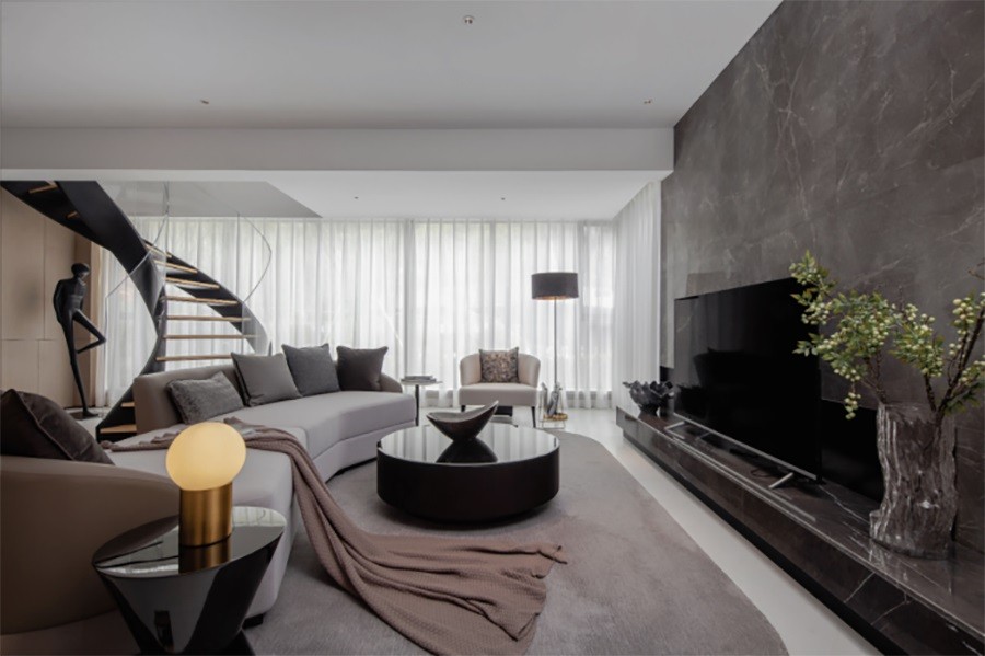 本案列为实现现代时尚的独特主义,这一次我们采用浅灰的整体色调,大胆的雕塑艺术品,复式空间的黑色旋转楼梯 ,带来强烈的现代艺术气息,这种对比为住客提供不一样的选择,满足***感和差异化的审美需求。