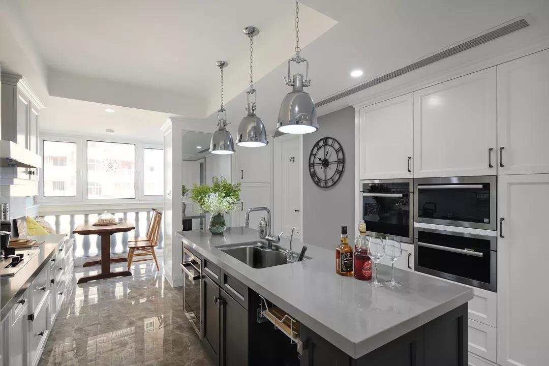 厨房是布置成了中岛橱柜的格局,把部分橱柜给嵌入了墙内,让厨房空间看起来不会那么拥挤,灰色与白色的结合带来轻松质感。