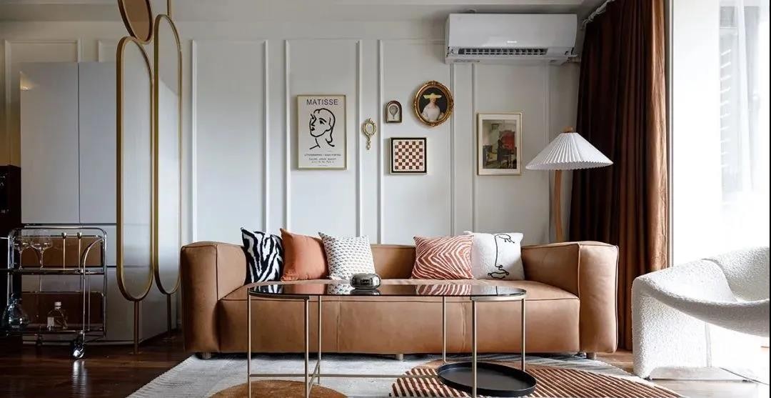 焦糖色沙发是整个空间的颜值担当,加上胡桃木电视柜、乳白绒面沙发椅、羊毛地毯,整个空间看上去格调感满满。