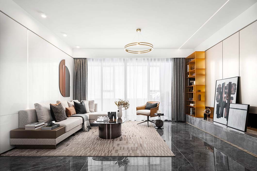 高定的浅咖地毯和灰黑大理石地面砖的搭配,灰白的沙发上跳跃着暖棕的皮革抱枕,深沉的橘棕小客桌于地毯上协调呼应,勾勒出淡淡的秋意。