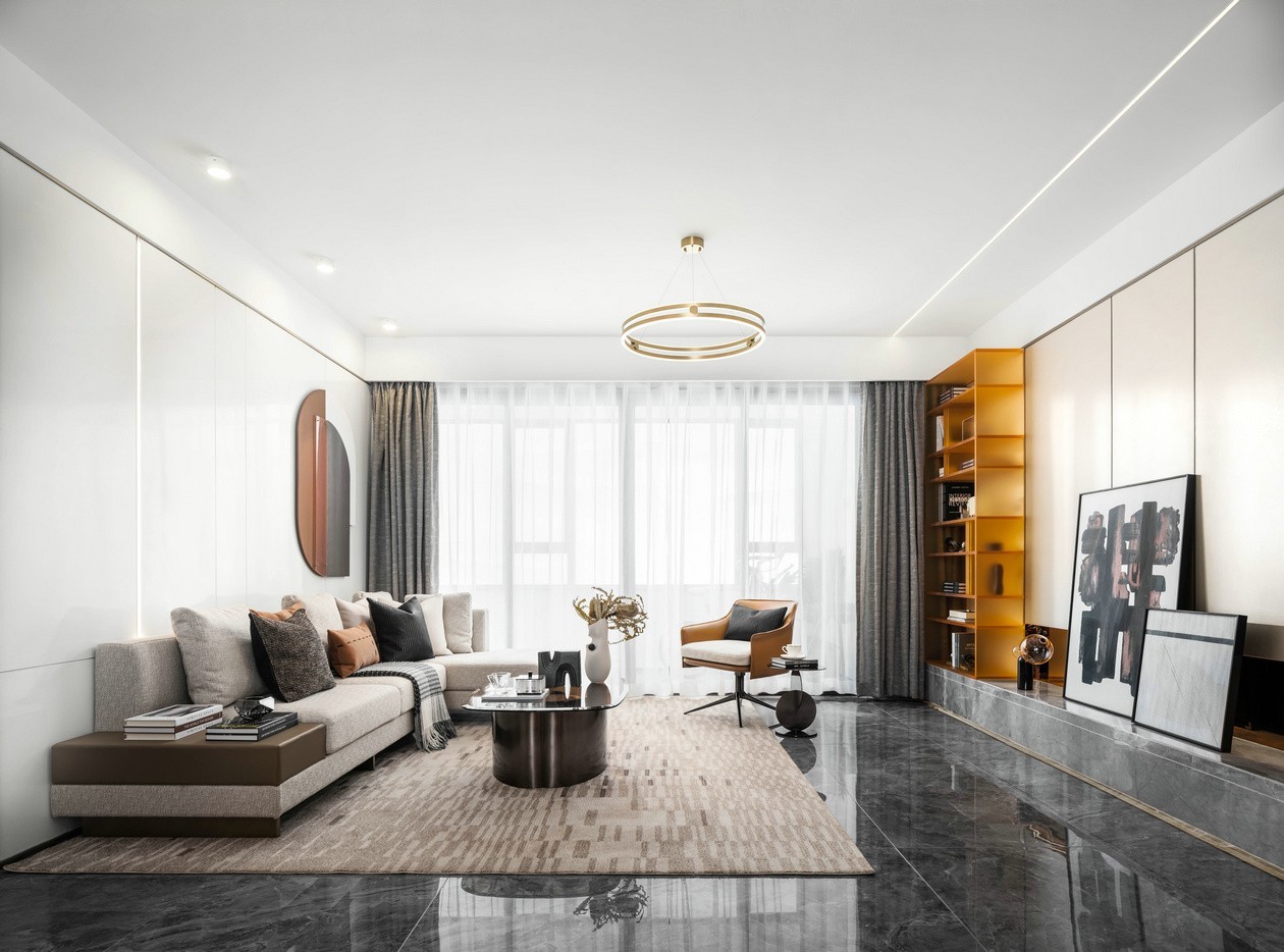 高定的浅咖地毯和灰黑大理石地面砖的搭配,灰白的沙发上跳跃着暖棕的皮革抱枕,深沉的橘棕小客桌于地毯上协调呼应,勾勒出淡淡的秋意。