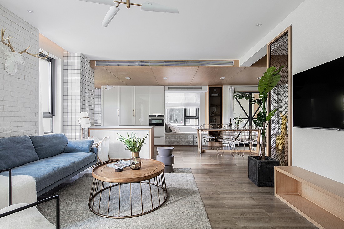顶面地面都是木色,地面颜色稍深,中间用大量的白色提亮整体空间。