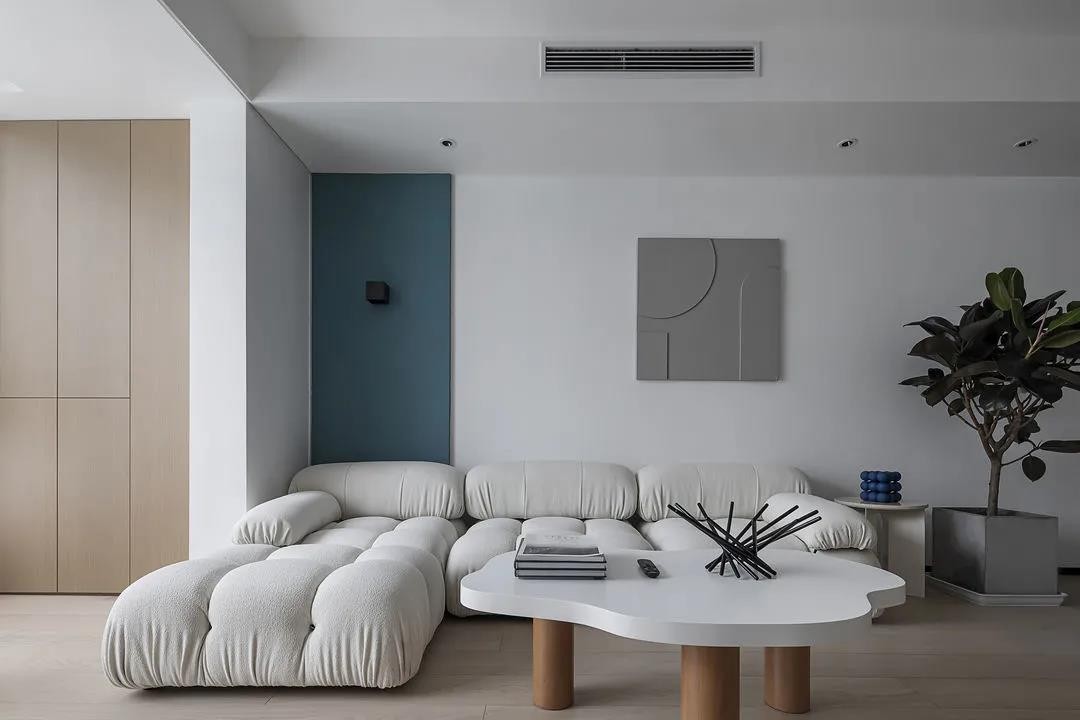 客厅简洁大气,通透的格局设计,将公共空间完全打通,让光影从不同方向流入,打造开阔无压的客厅空间。模块布艺沙发、云朵造型茶几,让客厅多了几分舒适与时尚气质。电视柜采用悬挂式设计,纯黑色打造在白墙衬托下,也显得稳重大方。