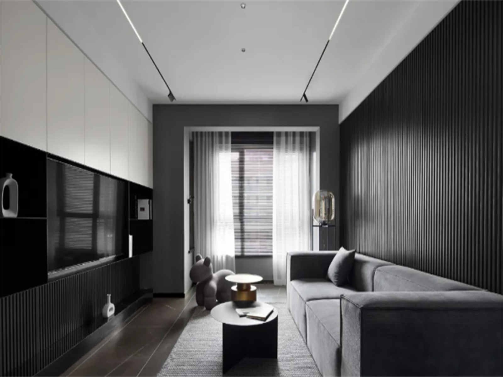 客厅以黑白灰为基调,加之简练的硬装线条、利落的灯光设计,充满时尚***感