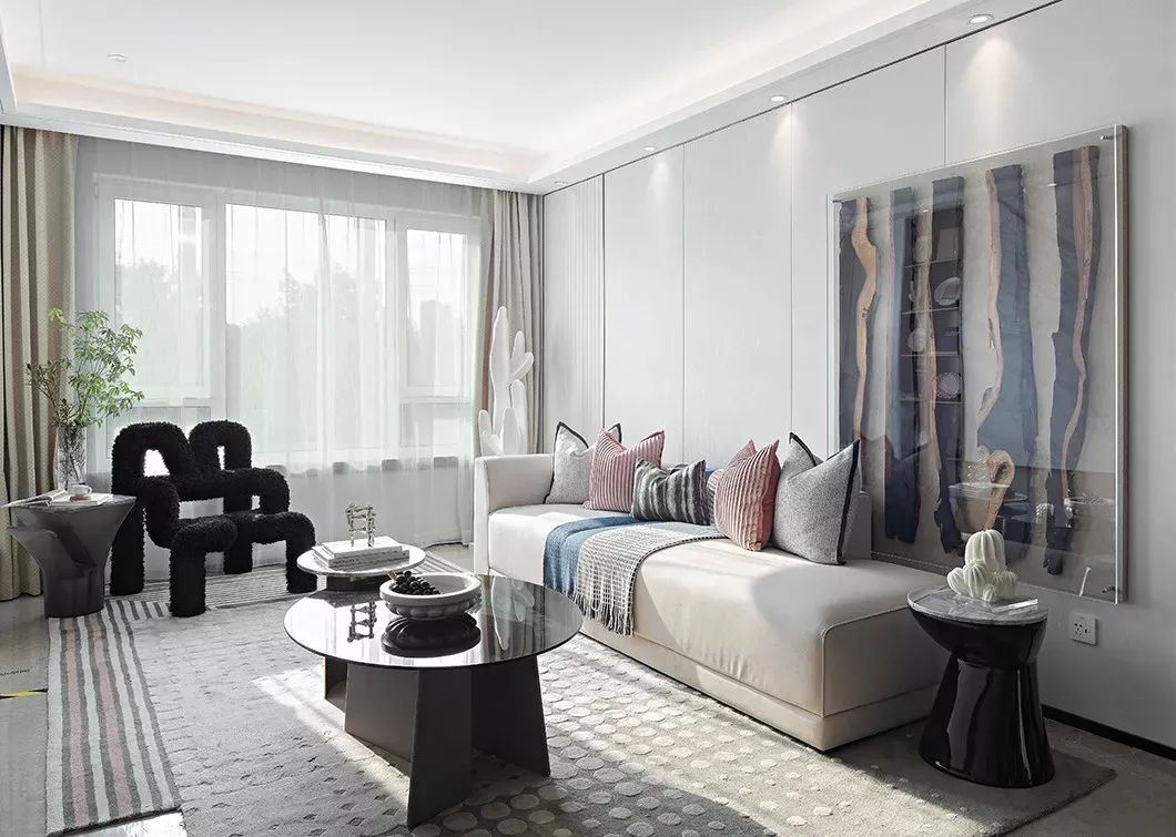 黑色的茶几边几,整个客厅都布置上简约舒适的地毯,也是充满自然轻松的时尚气质。