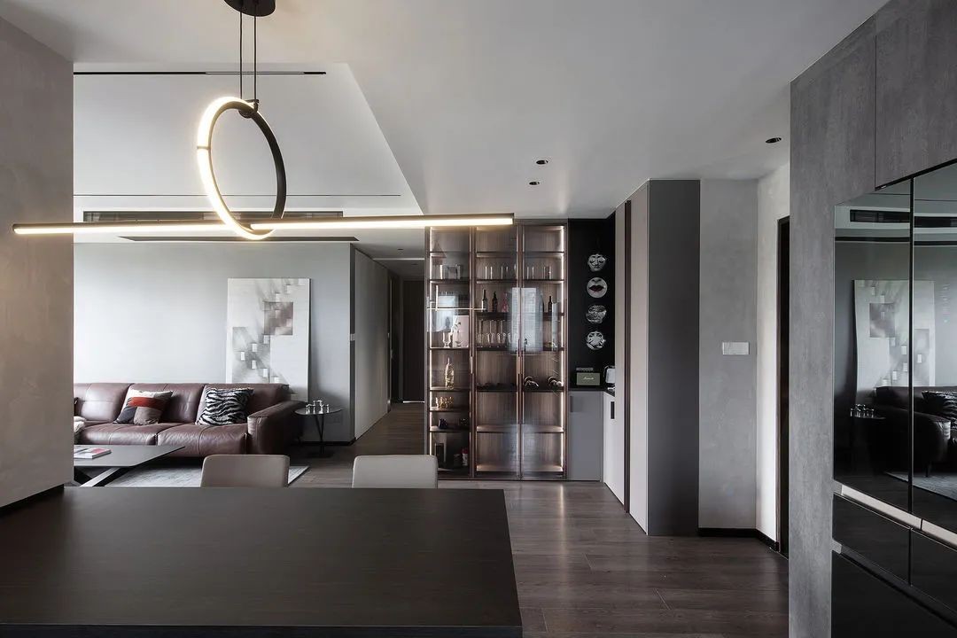 深棕色和黑色家居与灰色墙面相结合,在厚重沉稳中展现高雅的生活品质。黑色岛台作为西餐区,与暖光相结合,坐在桌边吃饭,让人沉浸式享受美食时刻。