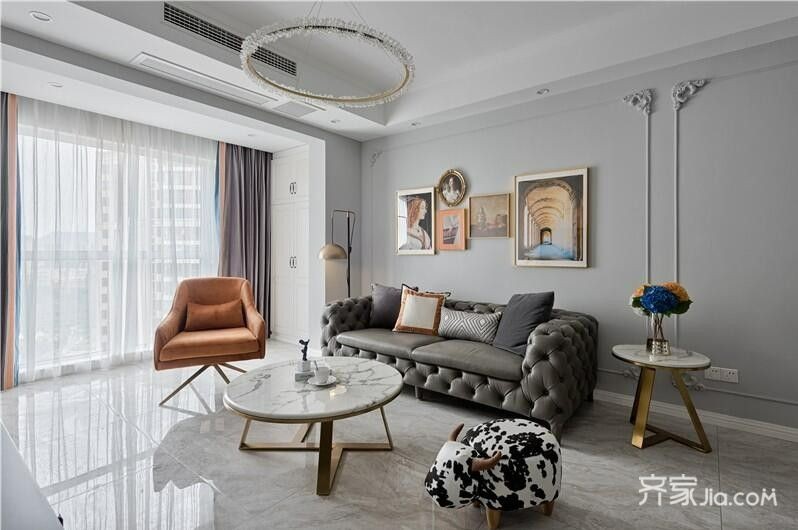 因为家里有小宠物的原因,业主和设计师沟通后,把客厅阳台纳入到客厅使用,阳光从落地窗撒入房间,让整个房间看起来明亮了许多。轻松迷人的橙赭色,点缀在大片的鸽子灰色调之上,金属、皮质、大理石、水晶灯材质互作搭配,呈现时尚摩登的观感