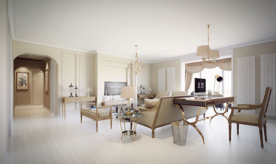 客厅大面积使用了米白色。电视背景墙中间做了外凸内凹的造型变化,两边也装饰了石膏线,使电视背景墙素净却不单调。