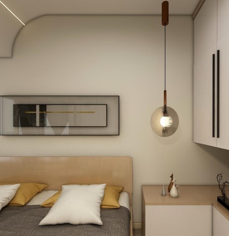 原木家具配上弧形天花使整个空间更柔和