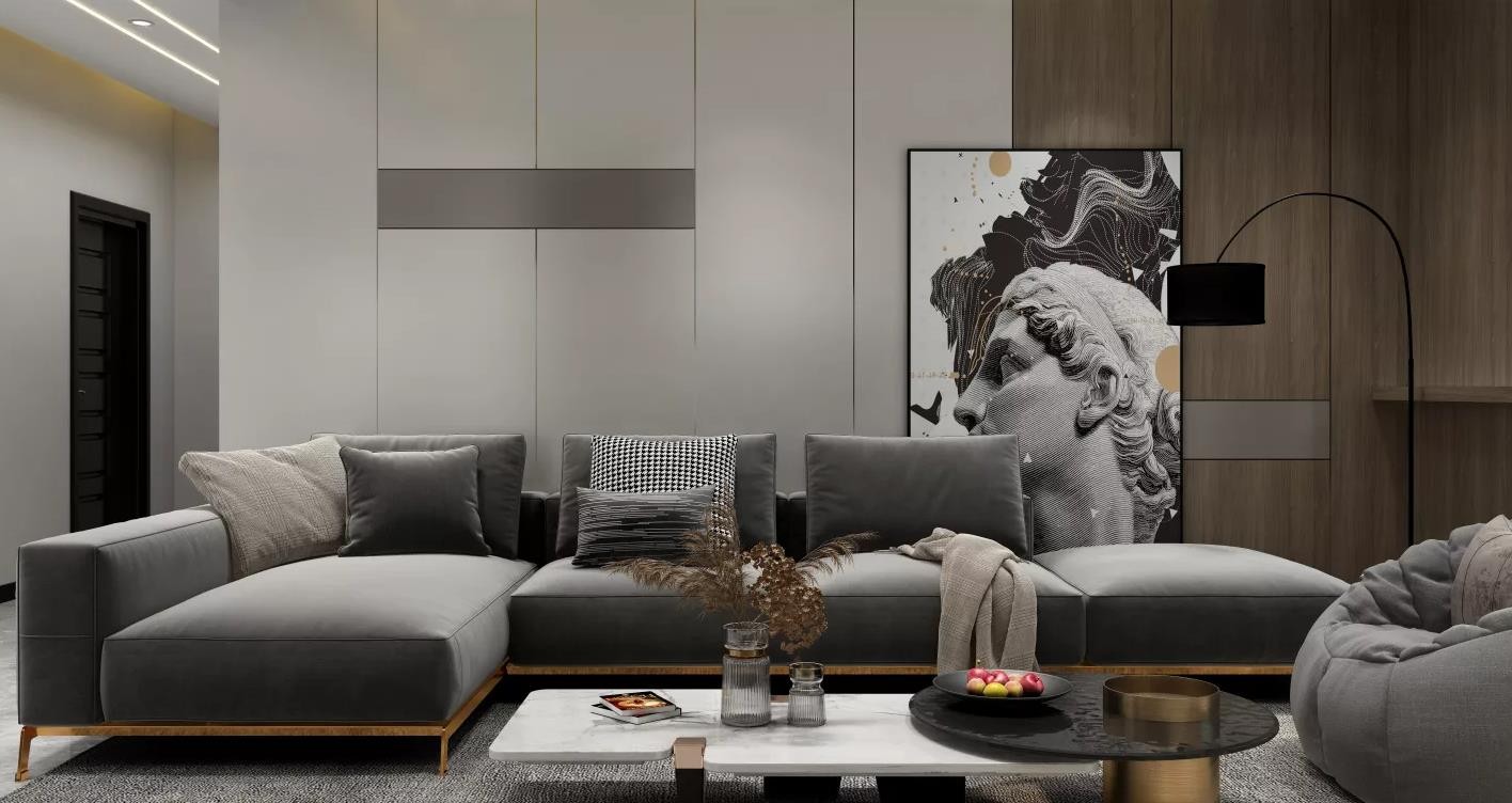 灰色色沙发靠墙摆放,几个小抱枕与挂画颜色呼应,再用一点盆栽装饰尤为可爱